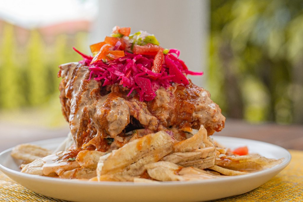 - 11. Para servir colocar una generosa cantidad de tajadas y colocar el repollo y una pieza de pollo frito encima. Bañar con el aderezo, la salsa de caldo de pollo y terminar con un poco de chismol encima. Acompañar de encurtido al gusto.