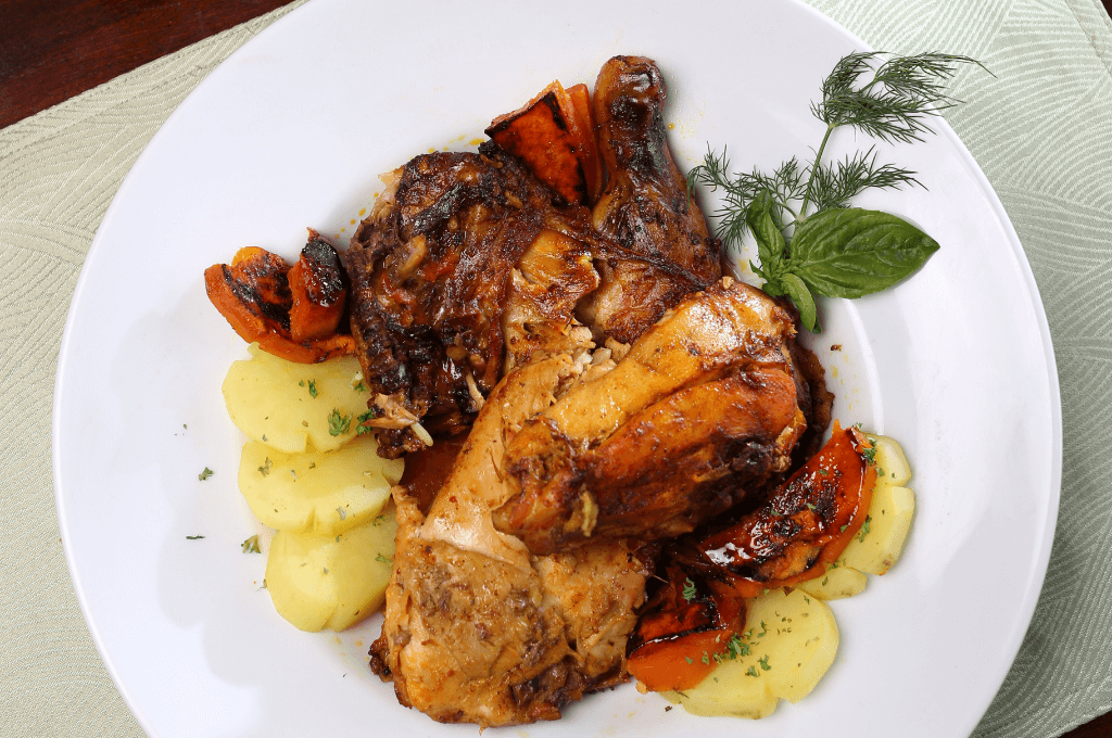- Pasado ese tiempo abrir el horno y hacer una incisión en la pechuga para verificar su cocción, si ya no brota líquido proceder a destapar, poner el camote junto con las papas alrededor y dejar 10 minutos más en el horno destapado para que dore. Retirar y servir.