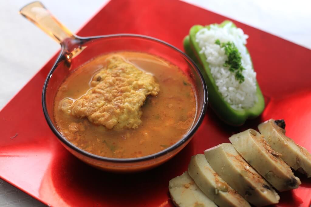 - Añadir el chile morrón y la cebolla y cocinar 2 minutos más, agregar la salsa de pescado la leche de coco y el limón, cocinar un poco más y servir.