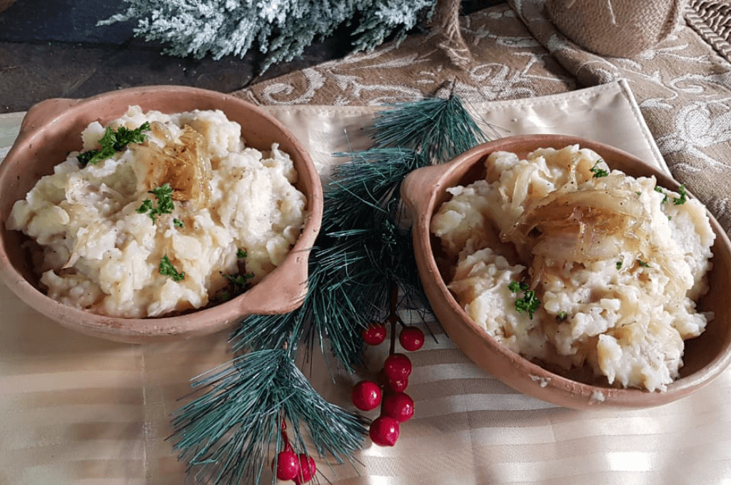 Puré de papa con cebolla caramelizada, un delicioso complemento para añadir a tu mesa en esta nochebuena.
