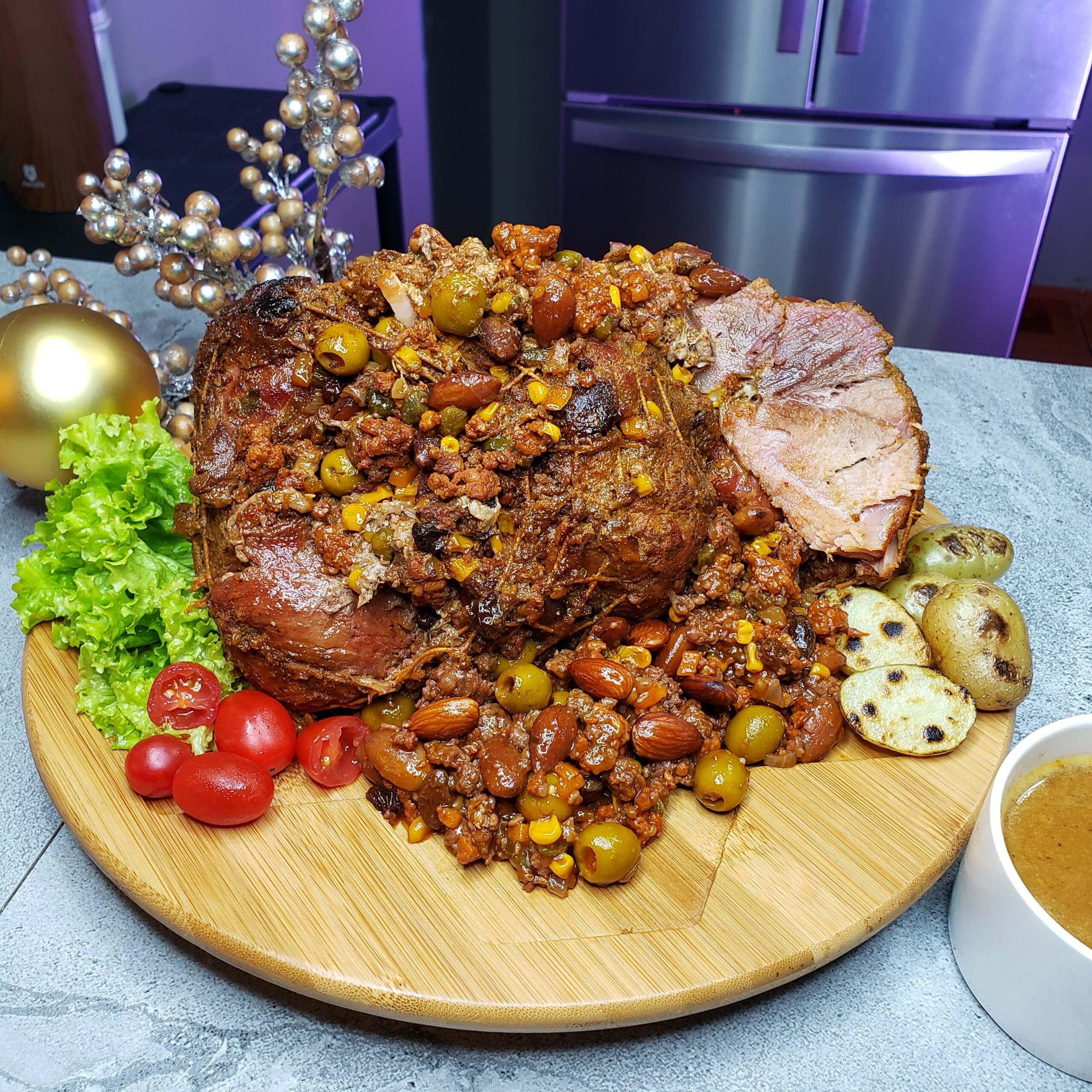 Luego debes licuar todos los ingredientes para adobar la pierna. Dejar reposar por al menos dos noches antes de rellenar. Una vez ya pasado el tiempo del marinado, rellenar con el relleno navideño y meter al horno por 2 horas y media a 350 °F. Retirar y servir. Para hacer un delicioso gravy o salsita, licuar todo el jugo de la pierna con los vegetales y rellenos restantes del molde sacado del horno, y listo.