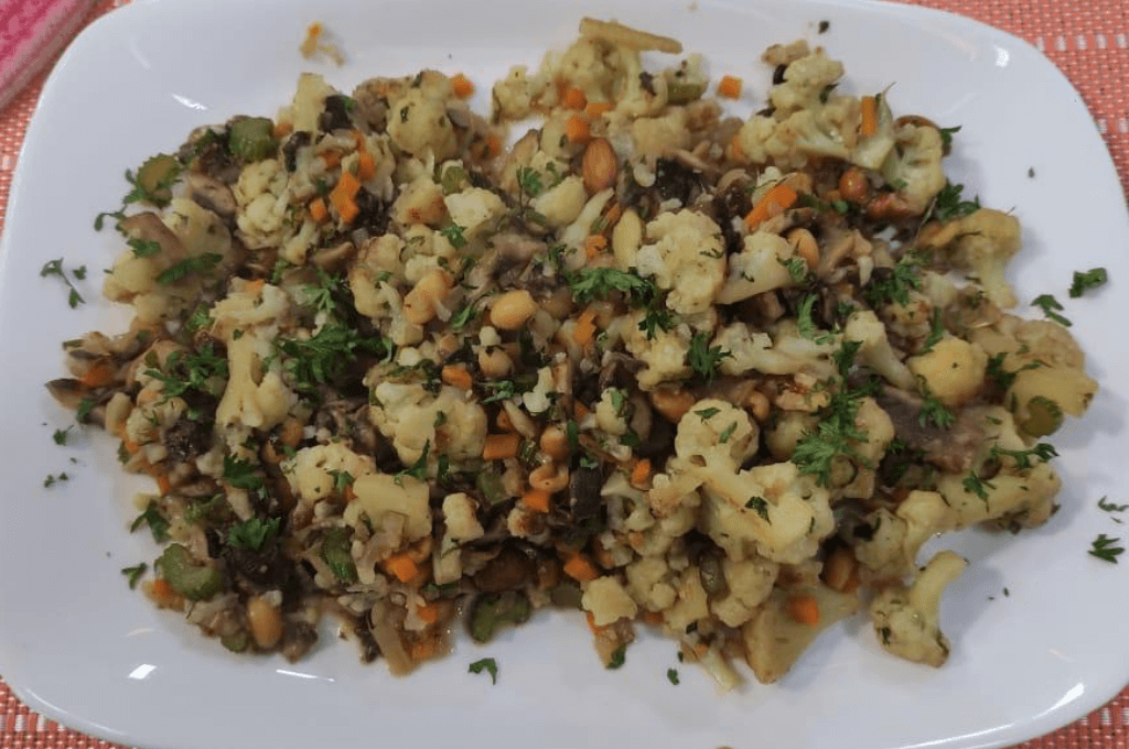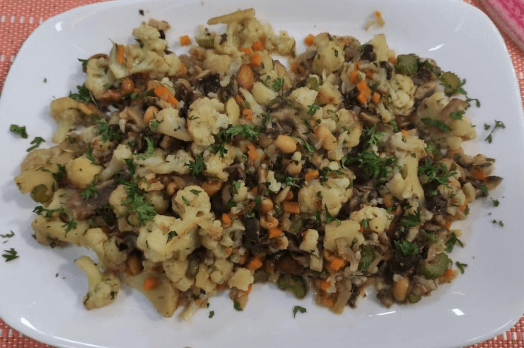 En nuestras mesas de día de Acción de Gracias y de Navidad no puede faltar un buen relleno. Es parte de un buen menú festivo de noviembre y diciembre. ¿No crees? Y aparte, aunque no haya pavo si hay todos los demás sabores deliciosos que hacen que se sienta como una fiesta de verdad. Este relleno vegetariano de coliflor nos permitirá disfrutar de una receta especial sin nada de carne. Este lleno es de verduras, y lo mejor es que tú le puedes poner más si gustas. El chiste es que te quede delicioso y lo puedas servir en tus fiestas.