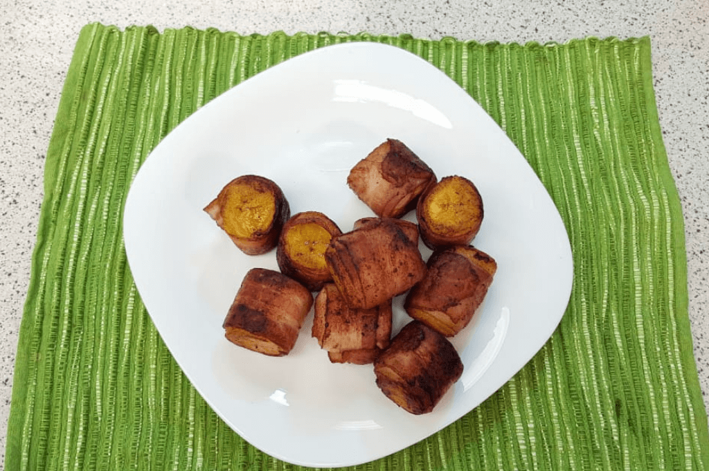 Los rollitos de tocino y plátano son un acompañante delicioso.