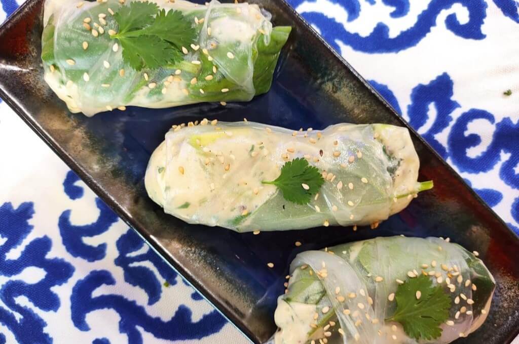 - Colocamos la pechuga junto con ¼ taza de mayonesa, la mostaza, 1 diente de ajo, la cebolla, ½ limón y el culantro triturando hasta formar una pasta espesa y uniforme. Hidratamos las hojas de arroz y colocamos una cama de espinaca, luego un poco de pasta de pollo y un gajo de aguacate; cerramos a hoja de arroz con la técnica aprendida en el programa y servimos.