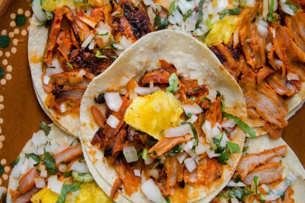 Tacos al pastor con piña, cebolla blanca y cilantro.