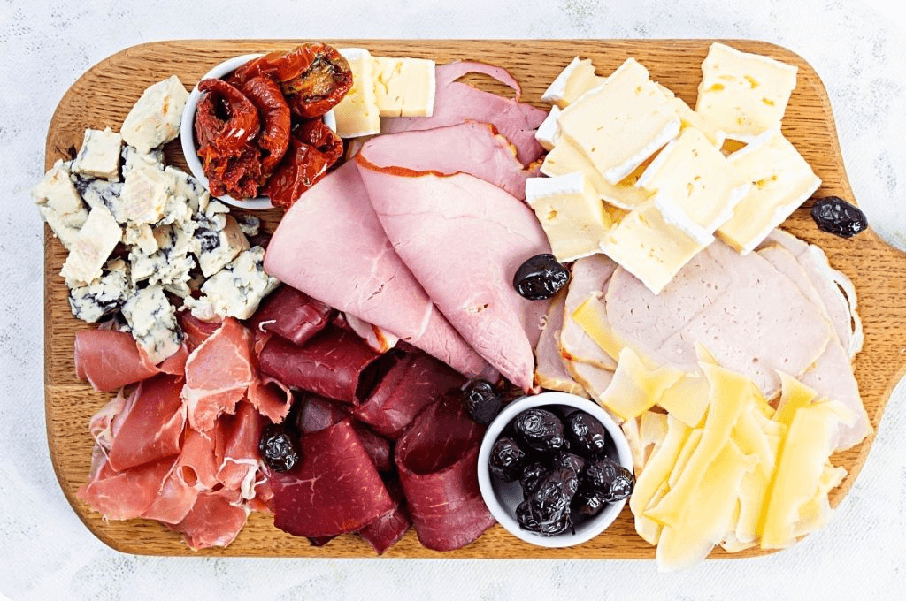 - Colocar los jamones junto con el prosciutto y salami, en grupos ya sea enrollados o doblados.