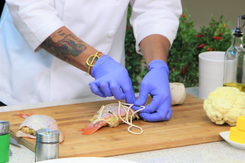 Realiza 3 amarres en cada tilapia para evitar que el relleno salga