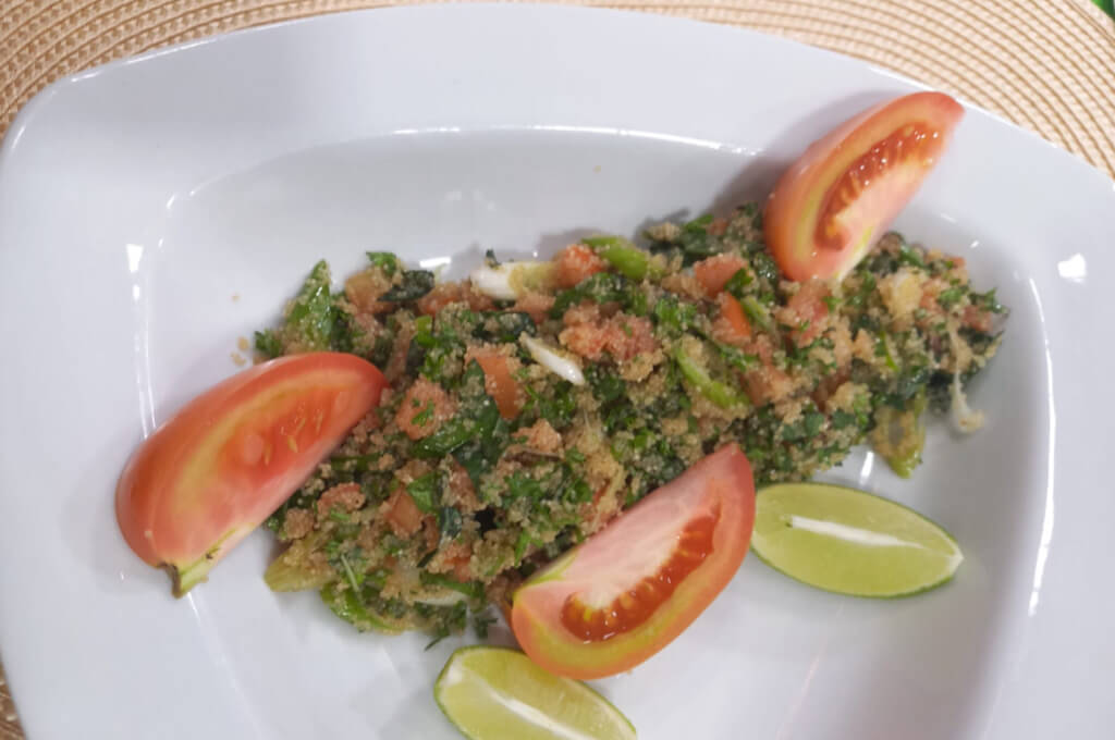 - Para la ensalada de repollo, mezclar el repollo con el jugo de limón, comino, salpimentar al gusto.