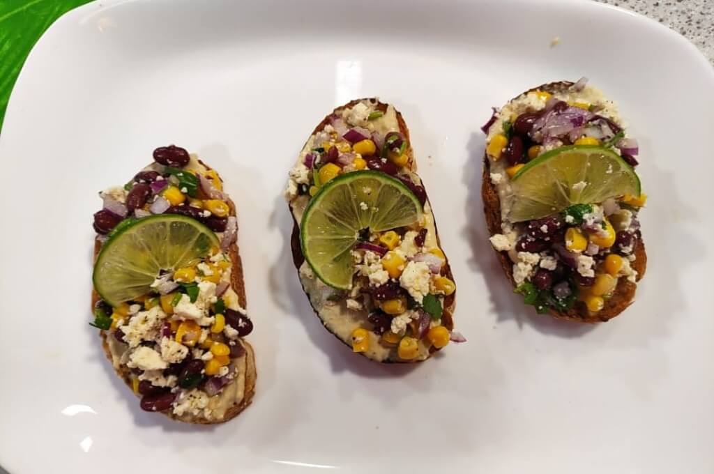 Ya luego, para armar la tostada de humus, utilizaras varios ingredientes para darle un estilo mexicano. Algunos de ellos son el maíz dulce, crema tahin agregamos el aceite de oliva, los frijoles cocidos, sal y pimienta y mezclamos bien. Posteriormente colocamos la mezcla en el pan campesino tostado seguido