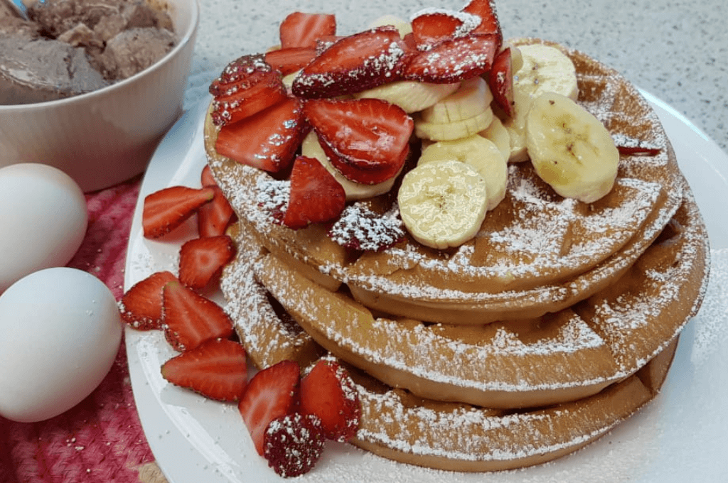 - Agregar ½ taza de la mezcla en la wafflera o dependiendo la capacidad de la wafflera, llenar al máximo. Cocinar hasta estar dorados por ambos lados. Servir con las frutas y helado al gusto y terminar espolvoreando un poco de azúcar glas encima.
