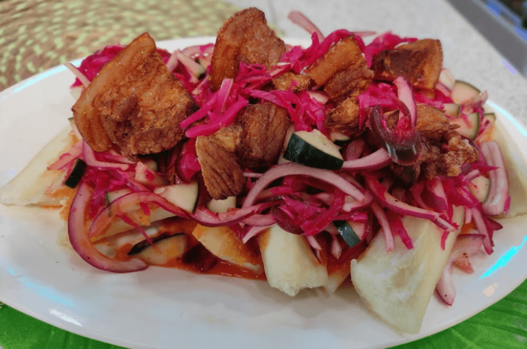 Una mezcla perfecta de yuca, chicharrón, salsa y encurtido.