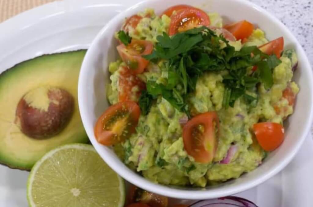 Necesitarás 3 aguacates, 1 limón, 3 cucharadas de mantequilla crema, 1/4 taza de cebolla roja picada, 1 jalapeño, 1/2 taza de tomate cherry y 3 cucharadas de cilantro picado.