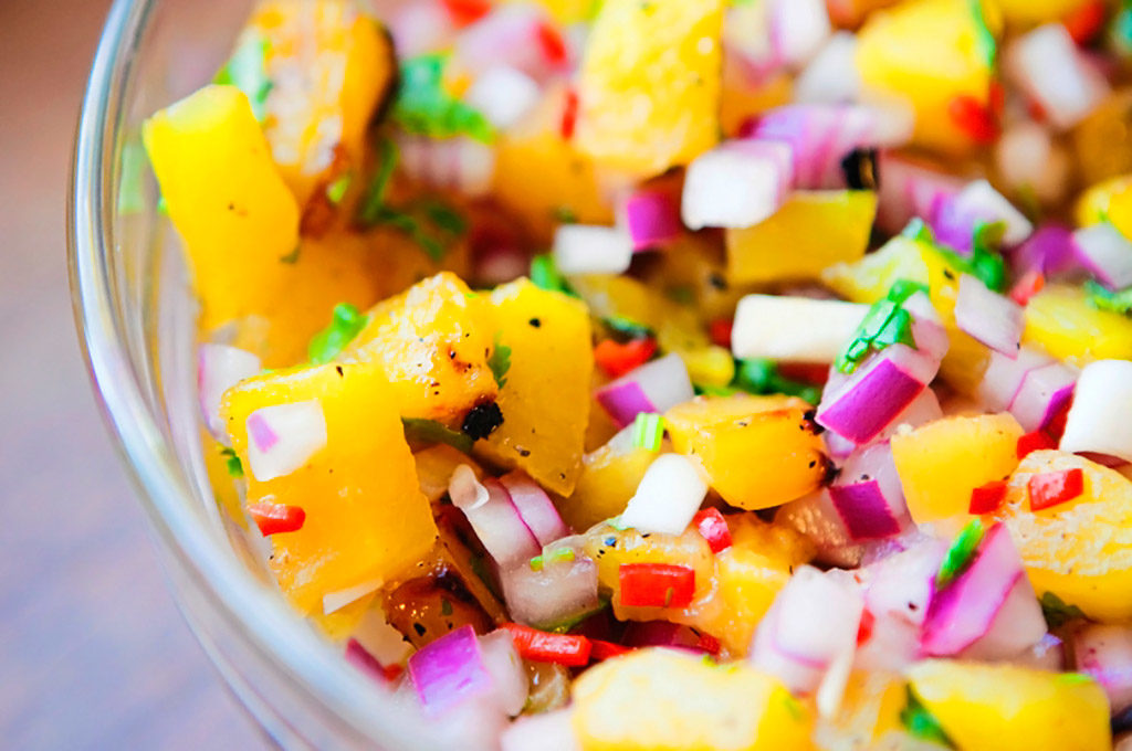 Calentar el asador y colocar ½ piña en rodajas delgadas, cocinarlas 3 a 4 minutos por lado para que se doren, bajar del fuego y picarla muy fino, colocarla en un tazón y agregar ½ chile morrón rojo, ½ cebolla morada, 2 dientes de ajo y cilantro fino al gusto, todo finamente picados. Aparte en otro tazón mezclar el jugo de 3 limones, con 1 cucharadita de jengibre rallado, 1 cucharada de aceite de oliva, sal y pimienta al gusto, verter sobre la piña, dejar reposar por 10 minutos y servir.