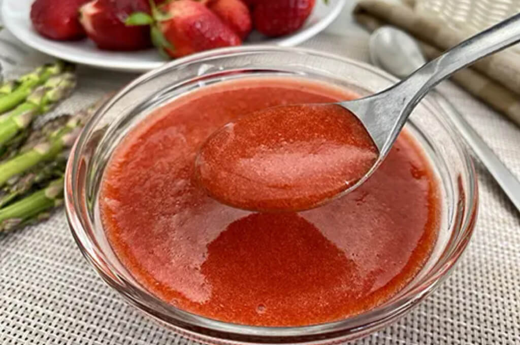 Mezclar en 1 tazón 1 taza de mermelada de fresa, 1 diente de ajo bien triturado, ½ cucharadita de jugo de limón, ¼ taza de vinagre de vino, y cuando esté bien unido todo, agregar 1 taza de aceite de oliva en forma de hilo y batiendo constantemente para mezclar perfectamente. Salpimentar al gusto y servir.