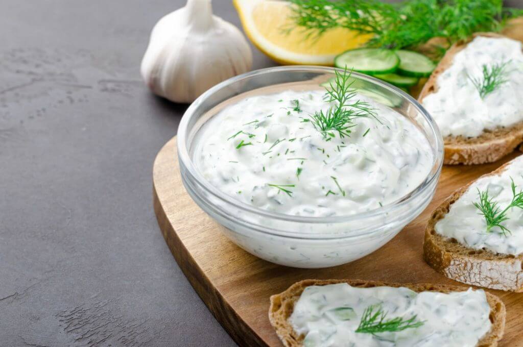 Agregar en la licuadora 1/2 taza de yogur, 3 cebollinos picados, triturar 1 diente de ajo y 10 hojitas de menta, agregas 1 o 2 cucharadas de agua; condimentar con sal al gusto.