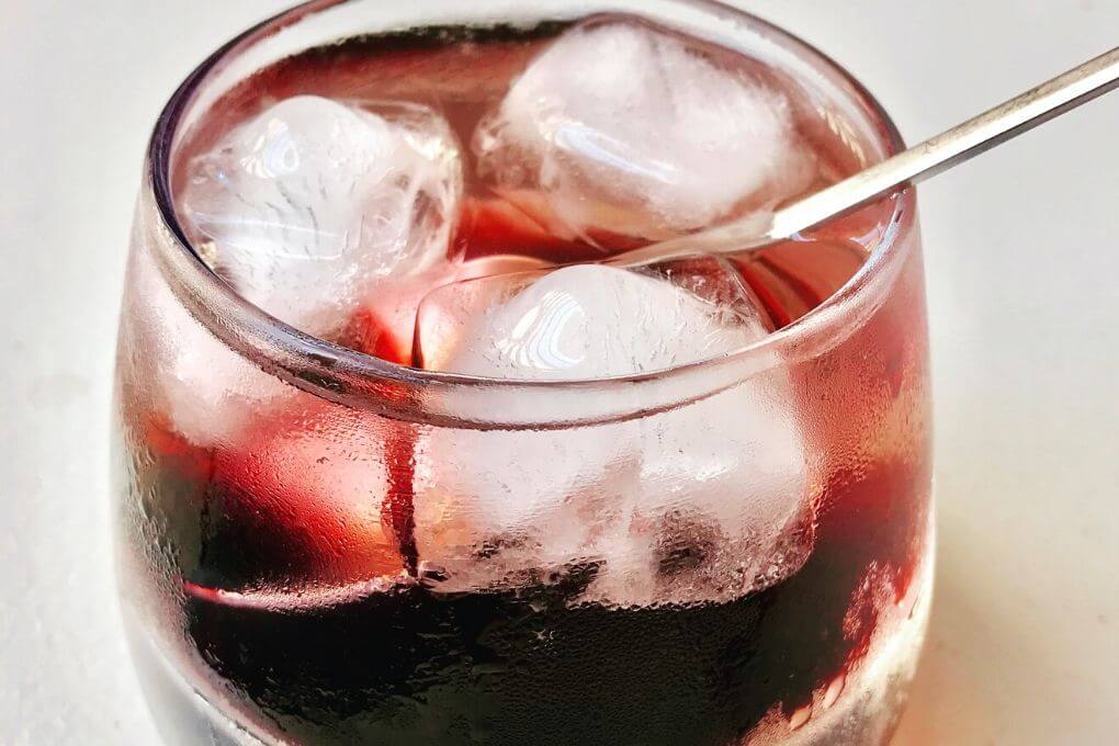 Mezclar en un jarrón 1 vaso de refresco de cola y 1 vaso de vino tinto, servir en vasos con hielo. Esta sencilla receta rinde para 2 vasos.