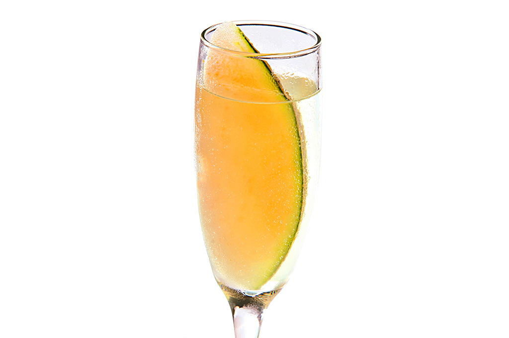 Verter en una copa alargada ½ shot de jugo de melón y llenar el resto con champán bien frio de su elección. Decorar con una tajada muy fina de melón fresco. Servir y disfrutar. Puedes agregar arándanos frescos u hojas de menta. Le aportará mucho color y sabor.