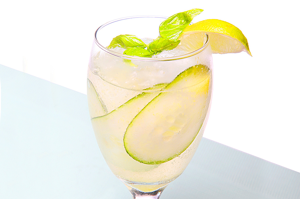 Corta 3 rodajas finas de pepino. Coloca hielo picado al gusto en una copa. Vierte ½ shot de jugo de naranja puro, 2 shots de ginebra y llena el resto de la copa con agua tónica introduce las rodajas de pepino a la copa, decórala con hojas de albahaca fresca y una rodaja de limón. Mezcla, sirve y disfruta.