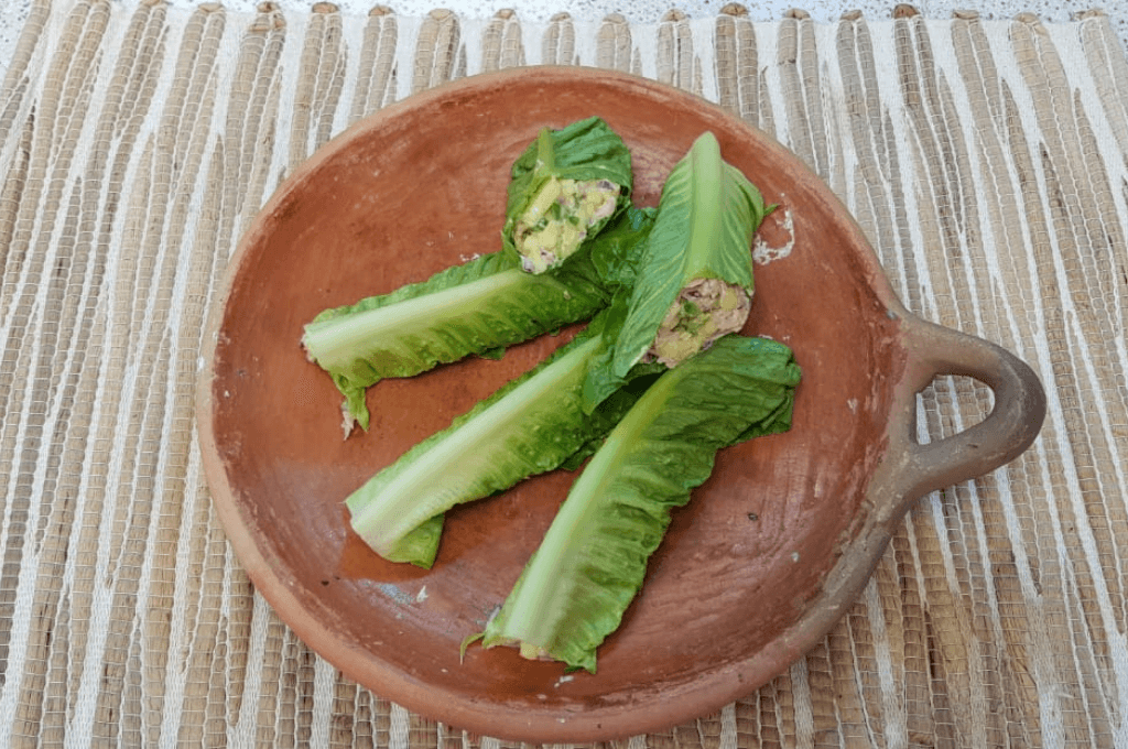 Colar muy bien la lata de atún, mezclar todos los ingredientes menos la lechuga en un recipiente y salpimentar al gusto. Colocar de 1 a 2 cucharadas de la mezcla en las hojas de lechuga y enrollar. Servir bien fríos.