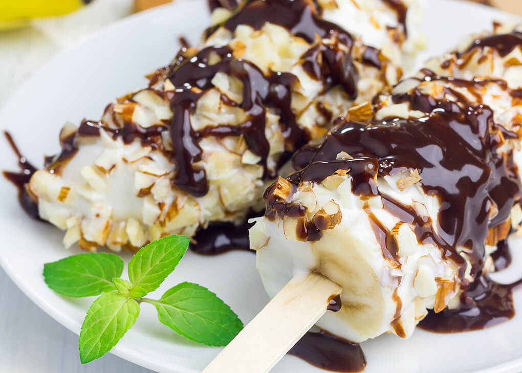 Coloca 2 bananos en un pincho de madera y cubrir con ½ taza de yogur sabor a vainilla. Después refrigera por lo menos por 3 horas. Para servir retira y cubre con ¼ taza de almendras y ¼ taza de sirope de chocolate.