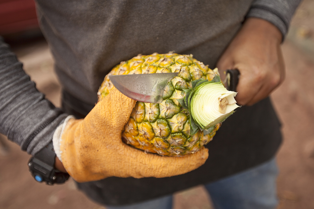 Después remover la cubierta y retirar los ojos de la piña (los pequeños puntos negros a los costados que son los que provocan alergia).