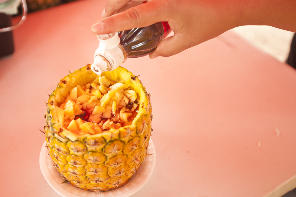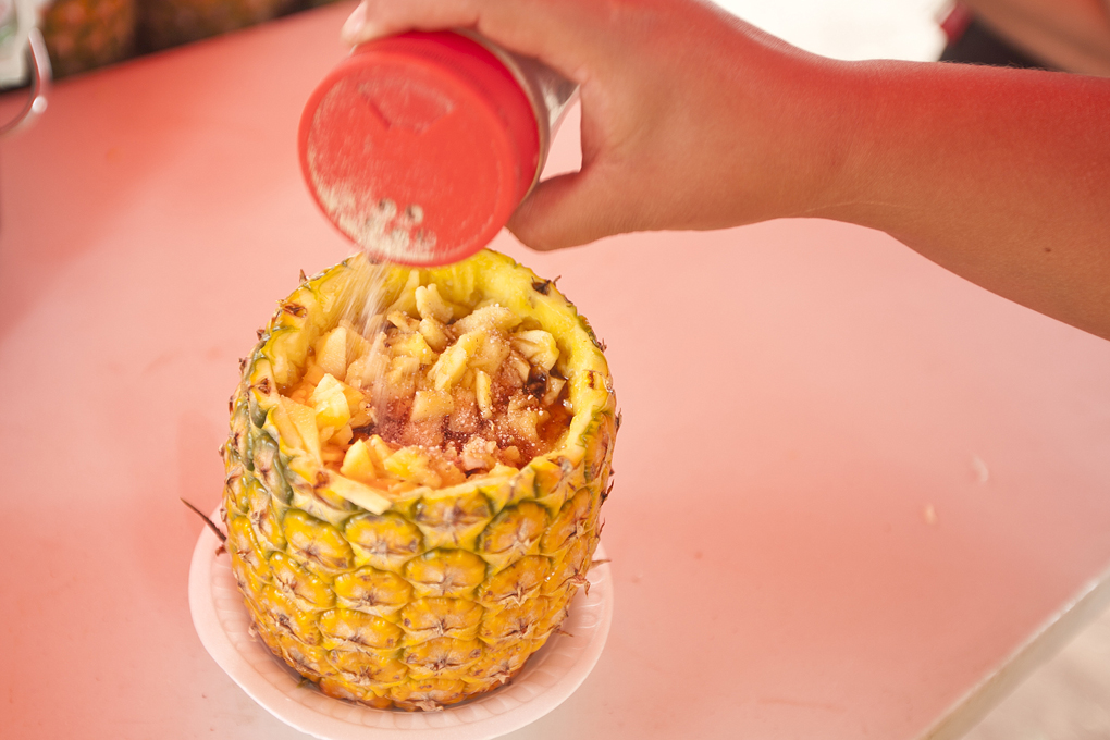 Salpimentar al gusto, removiendo todos los cubos de piña desde abajo para que quede toda sazonada. Luego agregar un chorrito de salsa inglesa, siempre mezclando todo para impregnarlo.