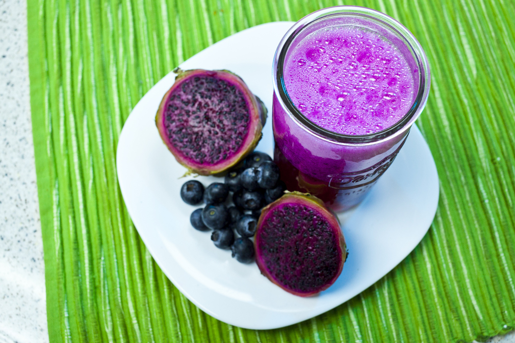 2/ Fresco de pitaya y arándanos: colocar en la licuadora 1 pitaya, ¼ taza de arándanos, jugo de 1 limón, 1½ tazas de agua, ¼ taza de azúcar y triturar muy bien, servir bien frío con hielo.