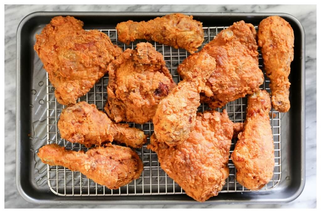 Si necesitas freir muchas piezas de pollo, es necesario recordar que el aceite debe volver a la temperatura antes de agregar más pollo. Asi mismo, te recomendamos utilizar manteca vegetal, esta aguanta altas temperaturas, no da sabor y es muy económica. Antes de empezar a freír revisa que este caliente, agrega un trocito de la masa y si burbujea está listo. Repita con el resto del pollo y para sacarlo de la freidora utiliza unos tenedores, así no romperás la costra.