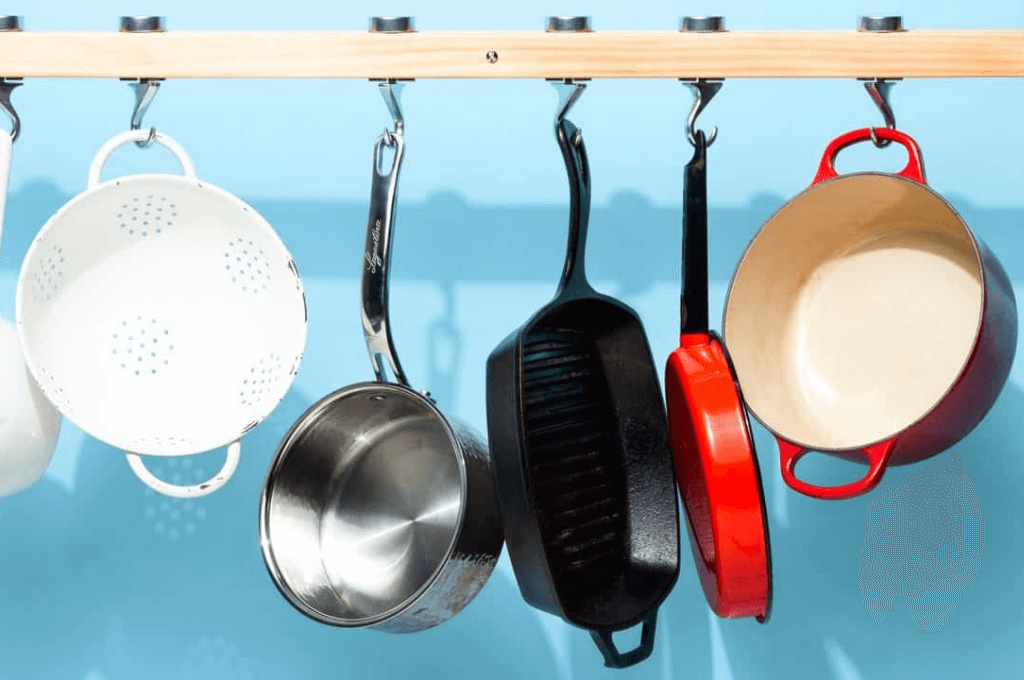 Evita guardar una olla dentro de otra, porque se daña el acabado y pueden golpearse. Lo más apropiado es utilizar separadores de ollas y guardarlas con las tapas invertidas (es decir, con la perilla hacia adentro). Las sartenes pueden ir colgadas en una barra organizadora.